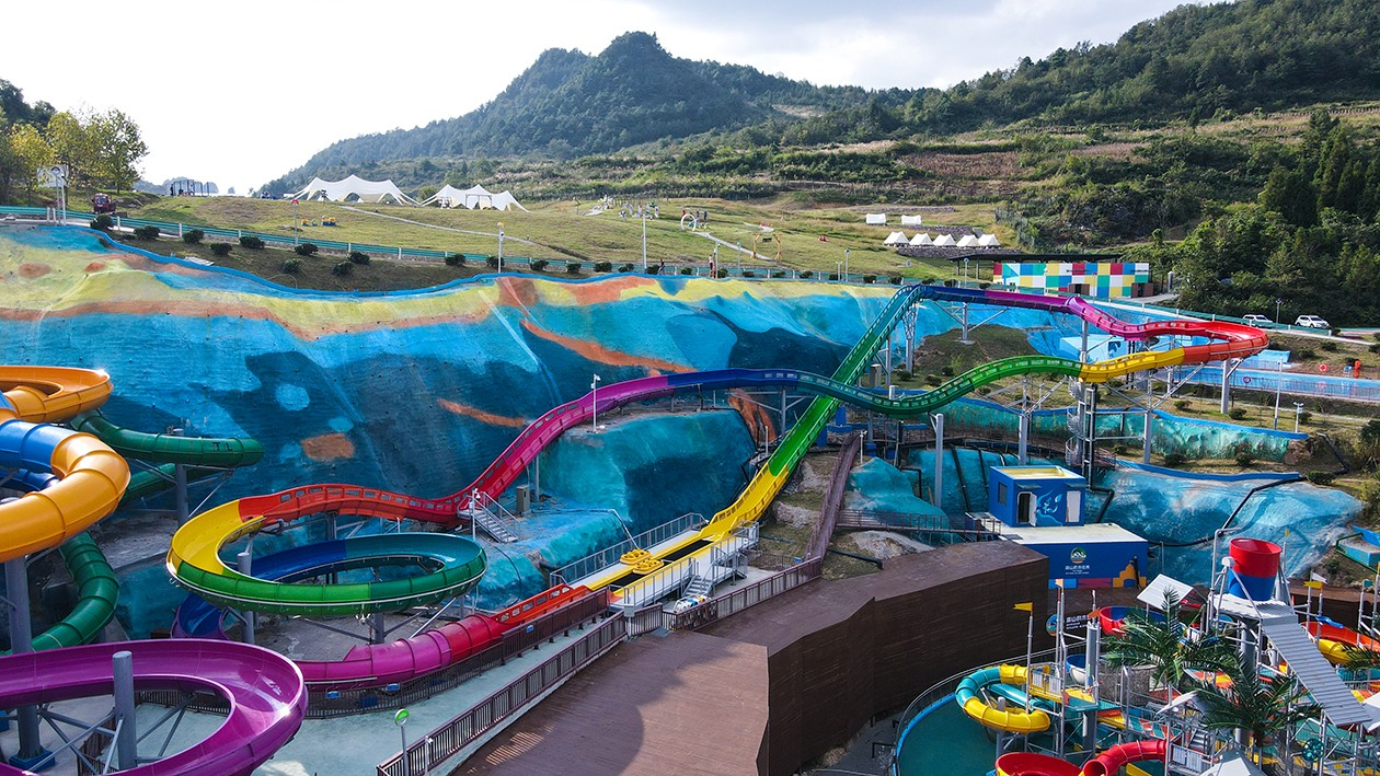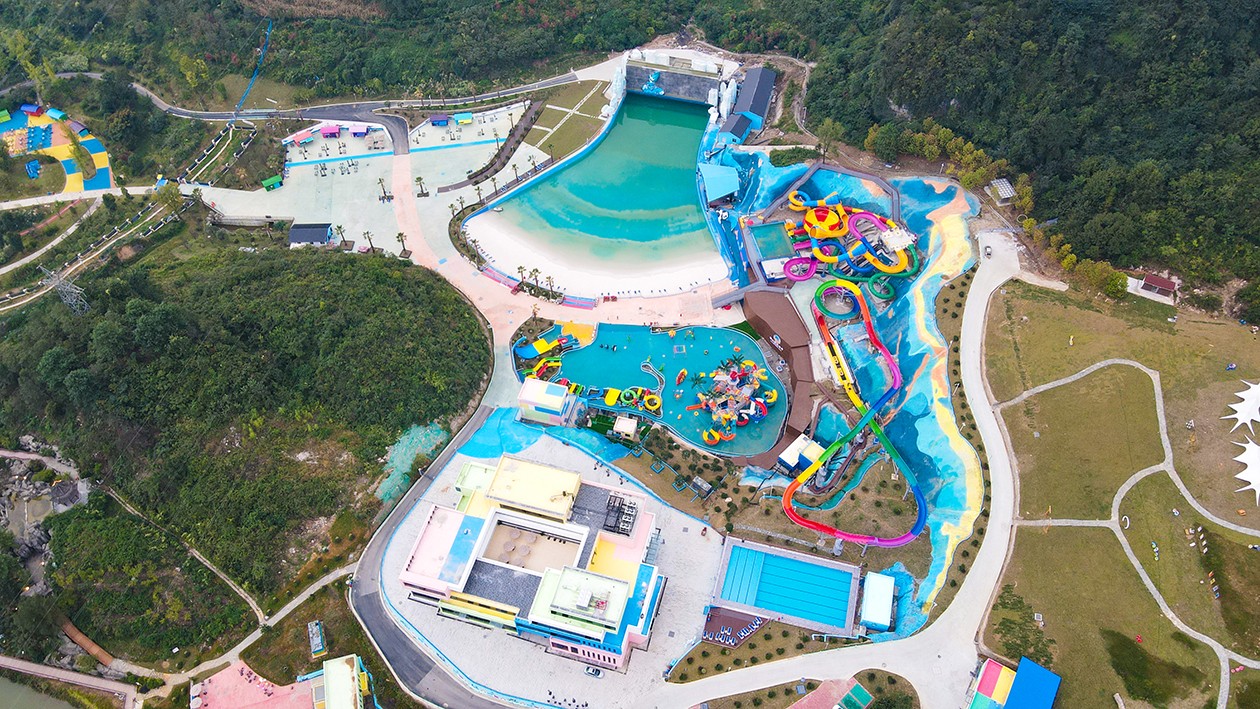 以“积木为核心设计元素,将色彩缤纷的积木造型与水上设施结合,融合红色文化元素,传播红色故事,打造集亲子互动、刺激体验、休闲度假于一体的水上乐园。