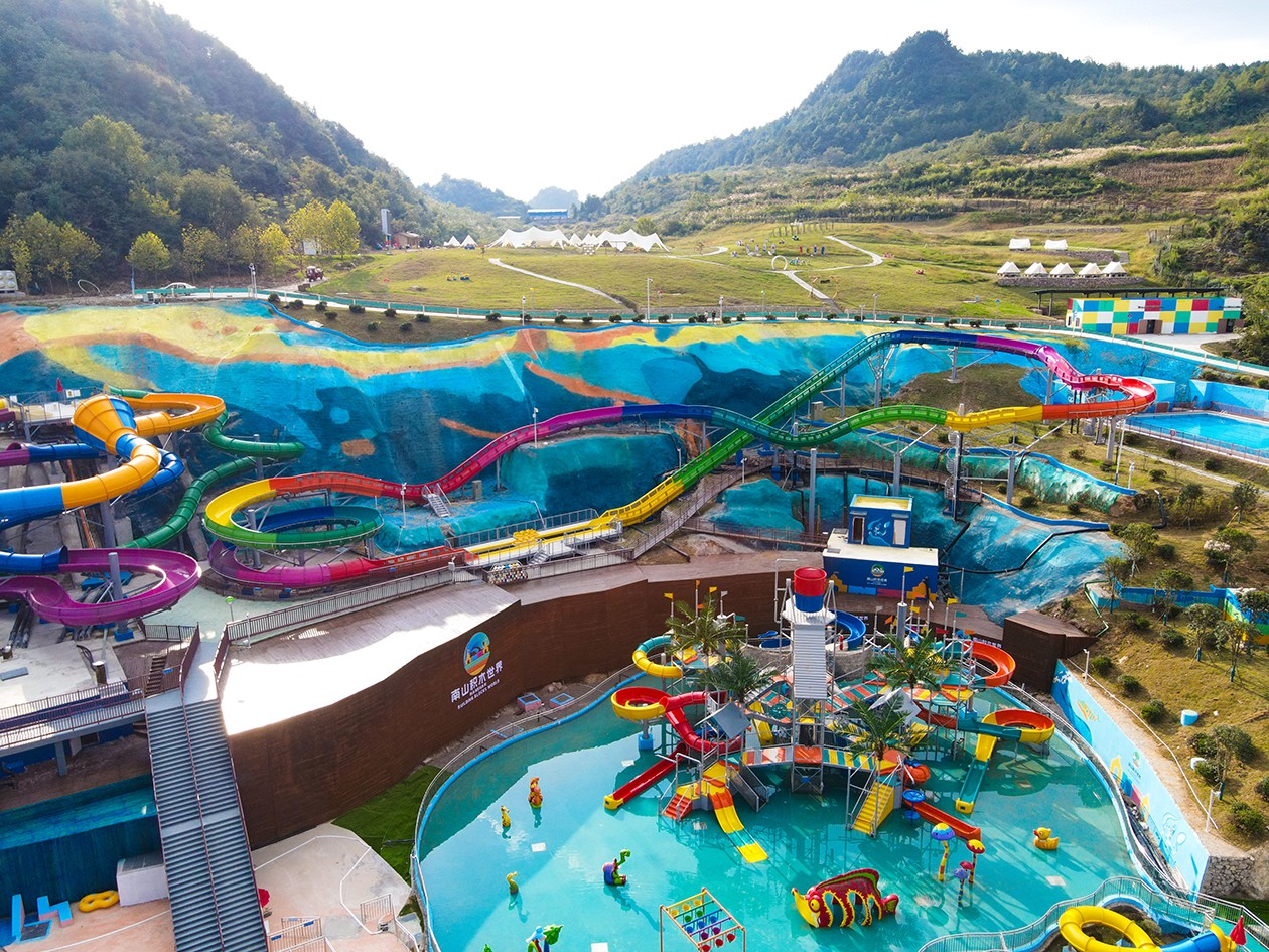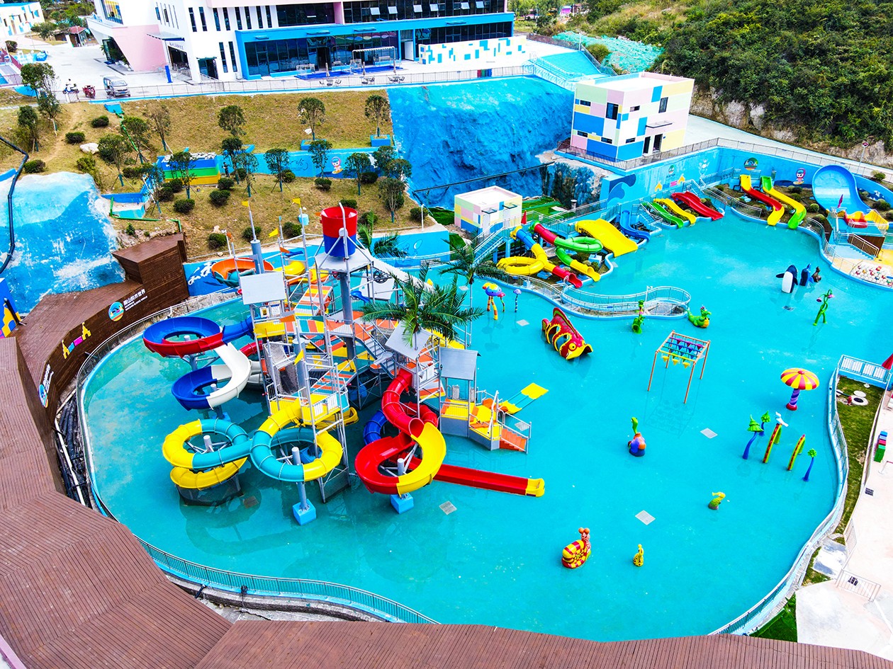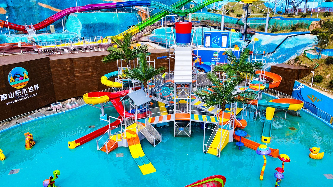 以“积木为核心设计元素,将色彩缤纷的积木造型与水上设施结合,融合红色文化元素,传播红色故事,打造集亲子互动、刺激体验、休闲度假于一体的水上乐园。